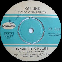 | A: Tuhon tietä kuljen (I'm A Fool To Want You) B: Tämä ilta aikaa on (It Had Better Be Tonight) |
